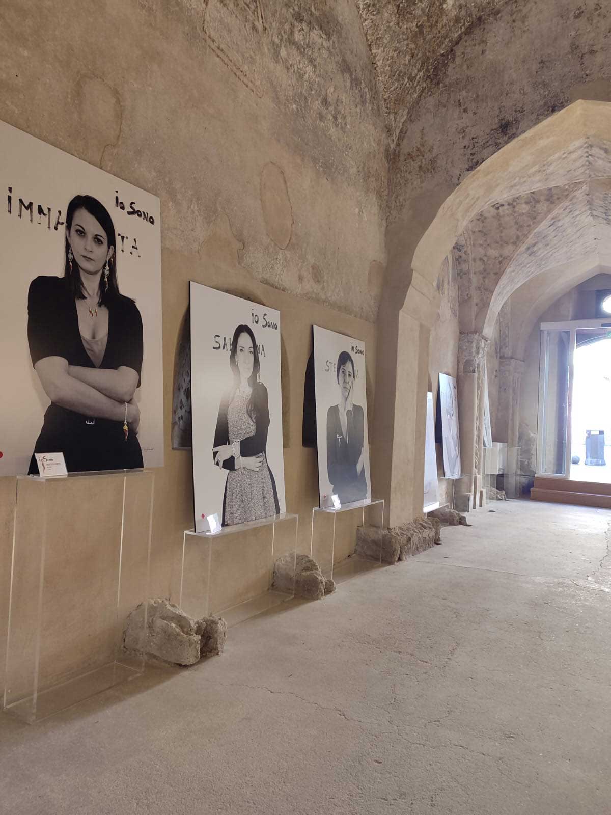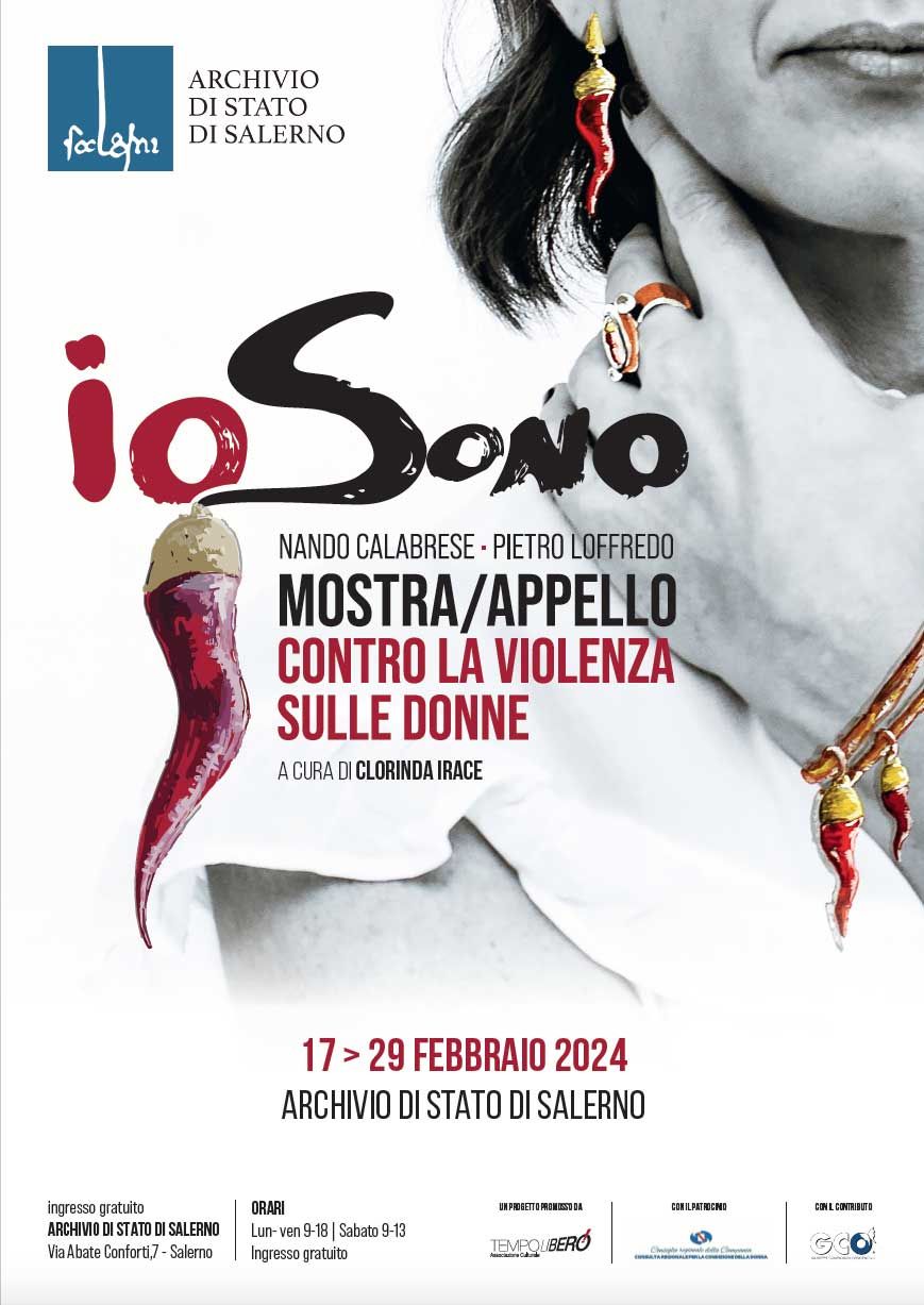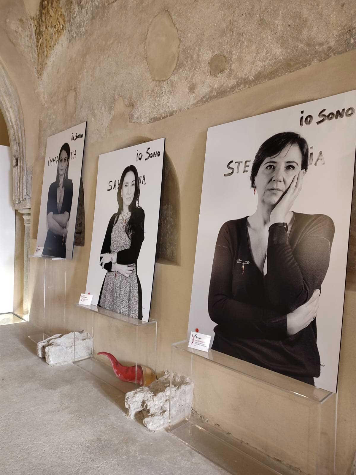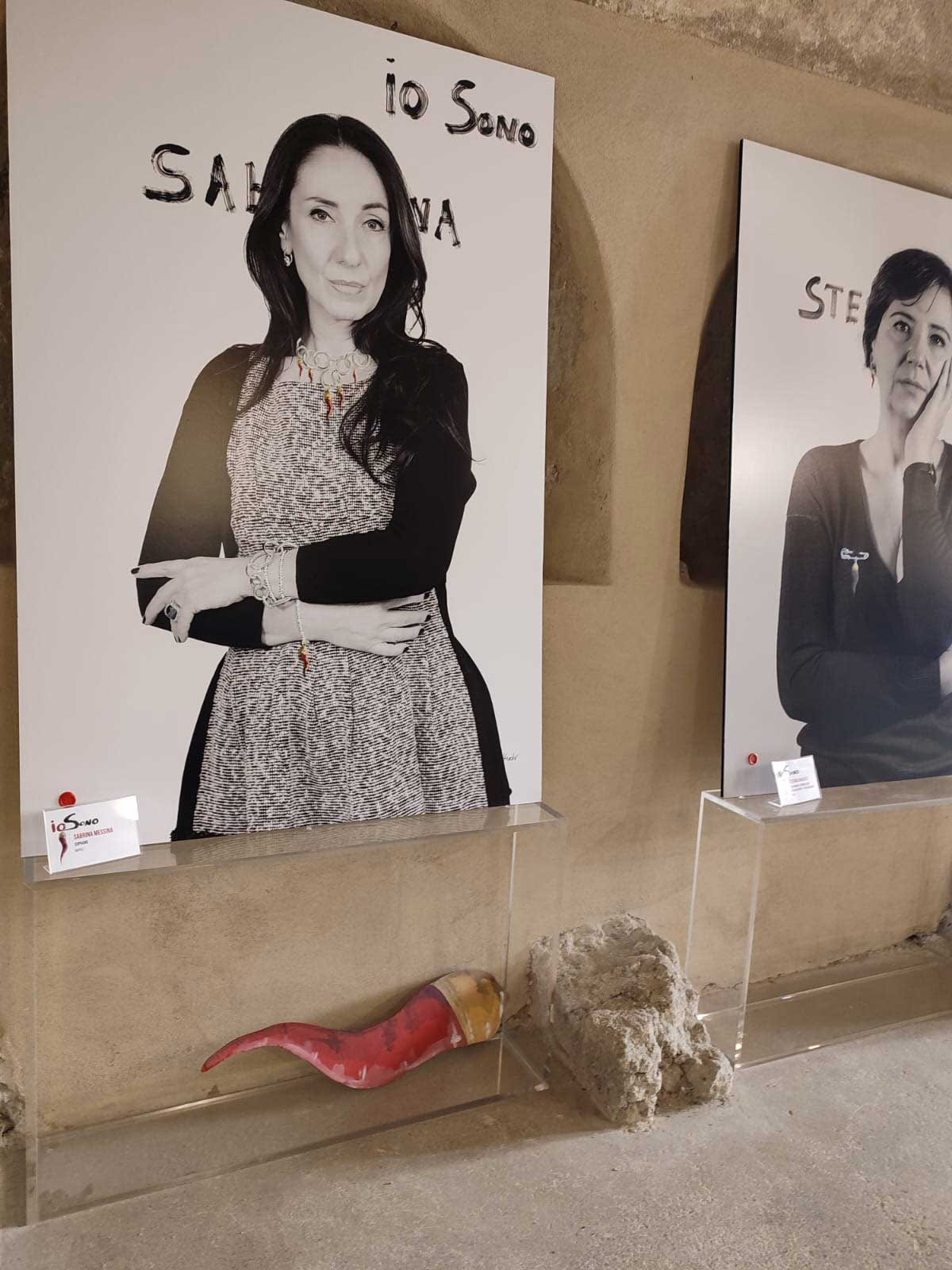 In questo scenario poco confortante, IO SONO diventa una galleria di volti diversissimi tra loro, che - ad eccezione della nota faccia di Antonella Stefanucci, “madrina” dell’iniziativa e socia dell’associazione promotrice, TempoLibero - appartengono a donne comuni, professioniste, operaie, casalinghe. Volti non necessariamente belli o alla moda, volti che reclamano di esistere, che, nella loro assoluta normalità, rivendicano quel diritto ad essere tutelato che è di ogni essere vivente. Nelle fotografie di Nando Calabrese si avverte tutta la tensione e la drammaticità della questione: non donne patinate o ritoccate per apparire più belle, non donne da copertina ma volti preoccupati, inquieti, in pericolo. Gli sguardi penetranti e talvolta cerchiati, stanchi, affaticati scavano nell’animo di chi guarda queste foto e sembrano invocare quel diritto ad esistere condensato nel titolo. Ad alleviare la drammaticità di queste immagini, realizzate in un bianco e nero “lacerante”, l’intervento pittorico di Pietro Loffredo, artista che nel suo percorso ha indagato a lungo il mondo della scaramanzia di tutto il mondo per trarne un insegnamento fondamentale: non basta! Il valore consolatorio ed illusorio di questa pratica tanto diffusa non è sufficiente a diventare protezione, aiuto. E allora, ironicamente ma non senza un velato disappunto, l’artista interviene interrompendo il bianco e nero delle foto e “squarciandolo” con un rosso evocativo, violento, problematico, quasi a voler porgere a queste donne un suo segno di aiuto, un’ultima chance in veste di fortuna che, provocatoriamente, altro non è che un appello per politiche più incisive. Ne risulta una mostra essenziale, priva di orpelli, quasi scarna per la precisa volontà di essere tale. Come se si volesse affermare che dinanzi alle troppe parole, ai troppi proclami, alle troppe promesse…le donne sono e restano sole in un mondo che produce femminicidi ad un ritmo davvero insostenibile.